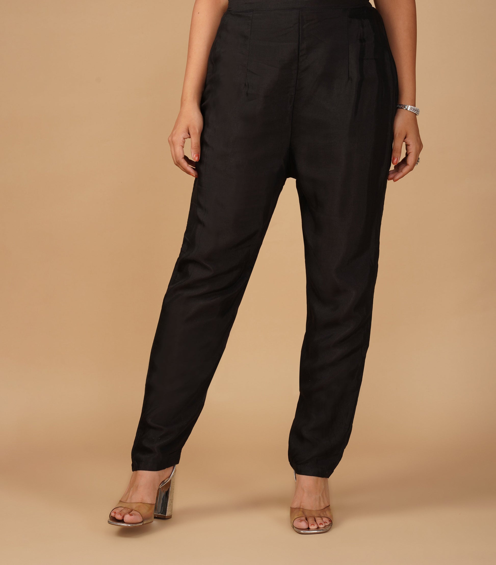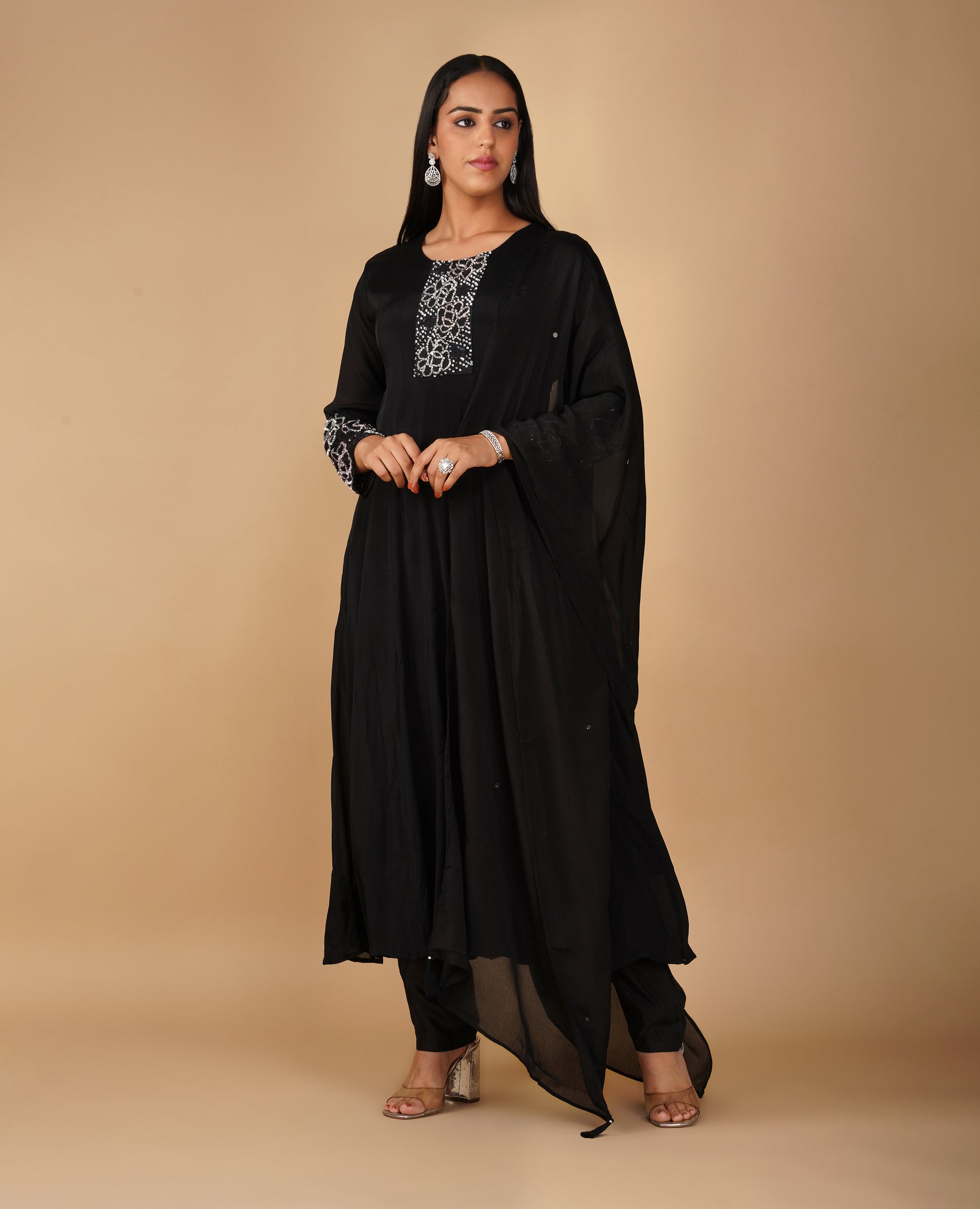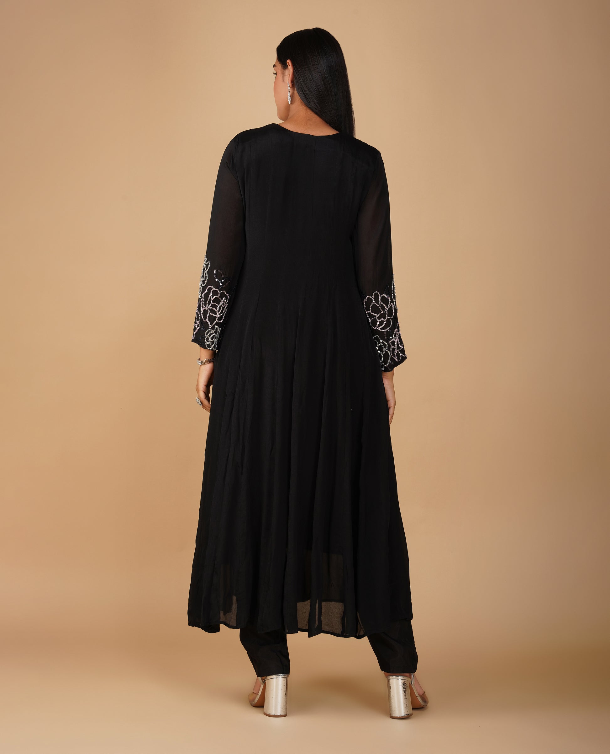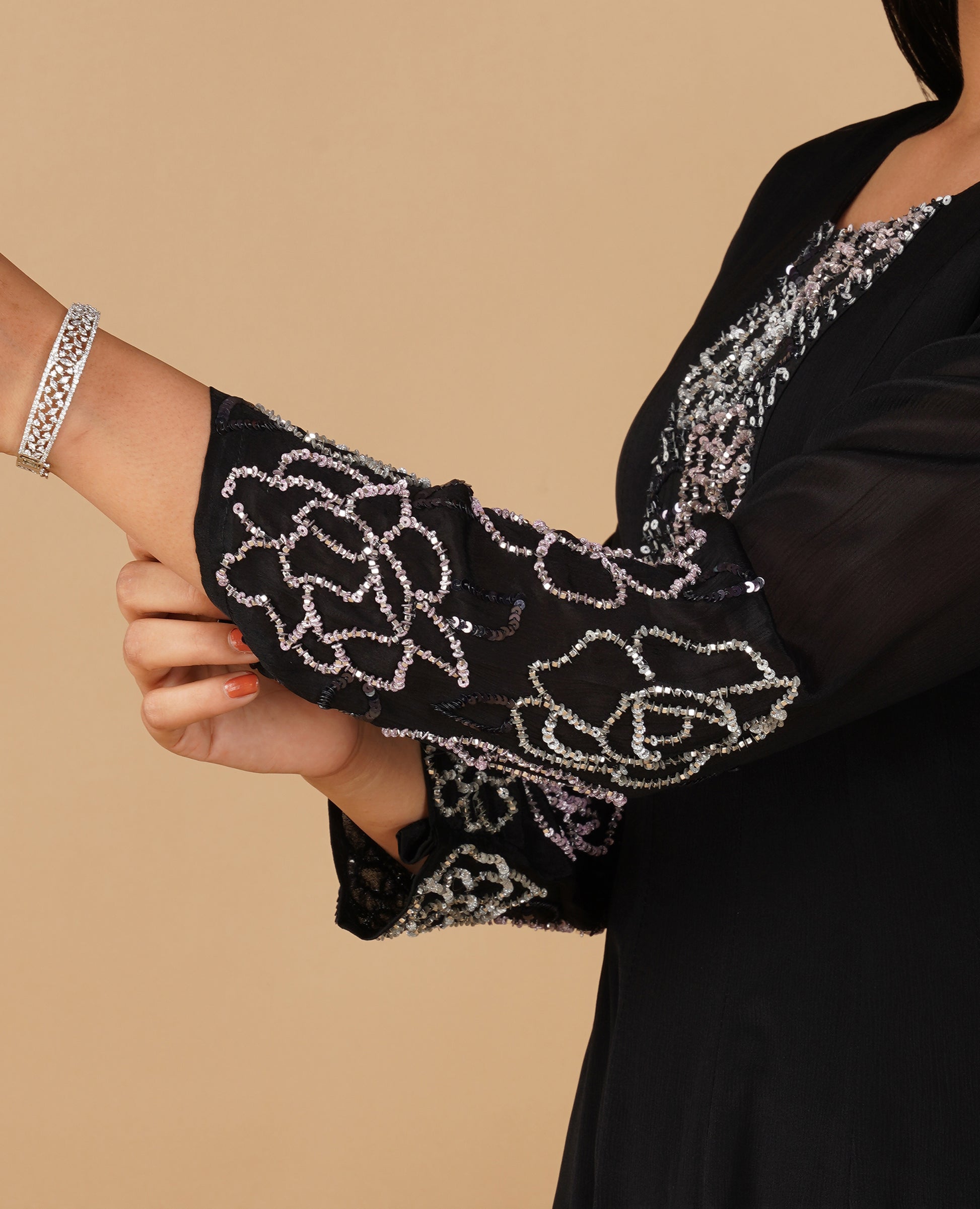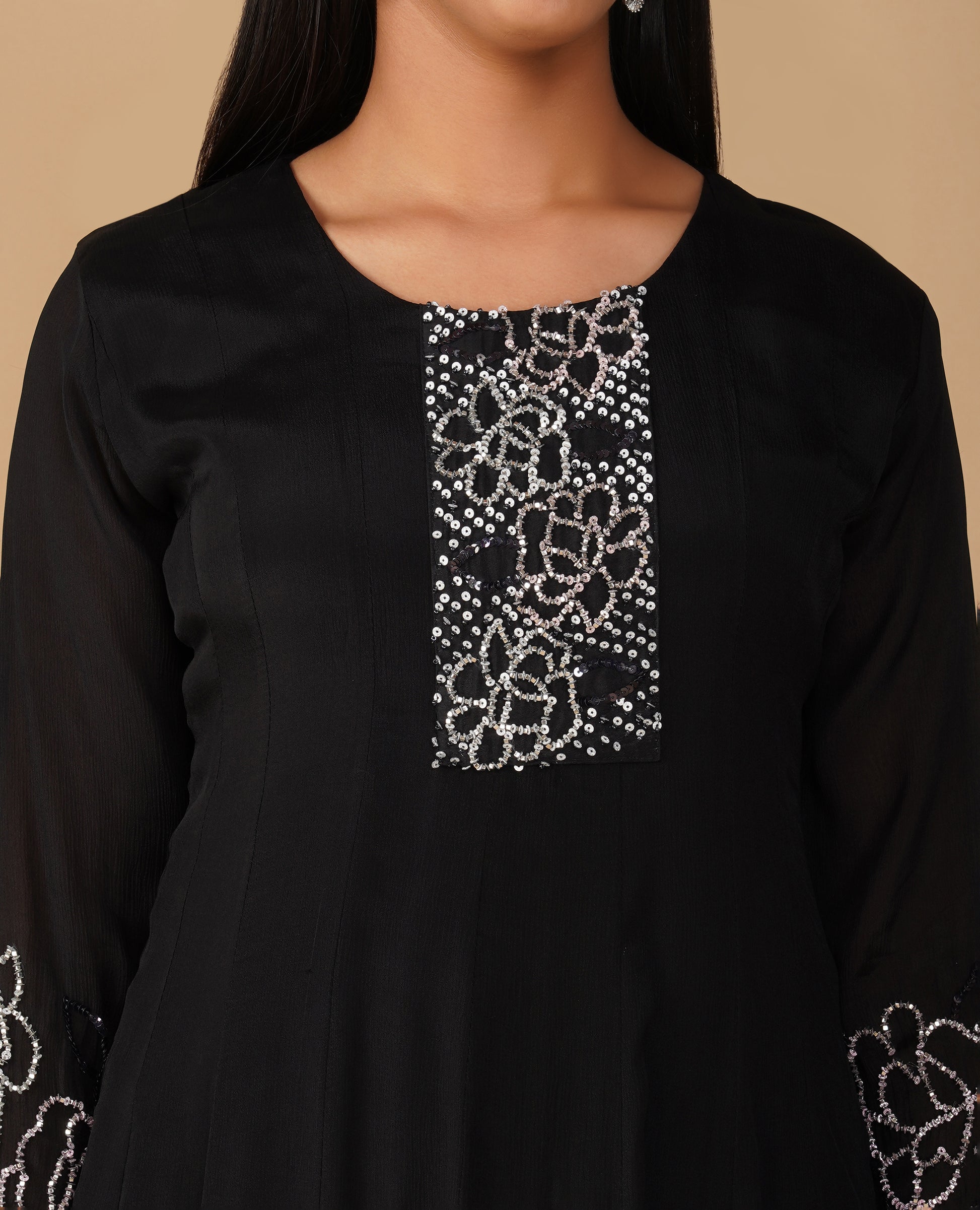 ( DELIVERY TIME 20 DAYS ) SEQUIN-EMBROIDERED BLACK CHINON ANARKALI SUIT WITH PANTS & DUPATTA