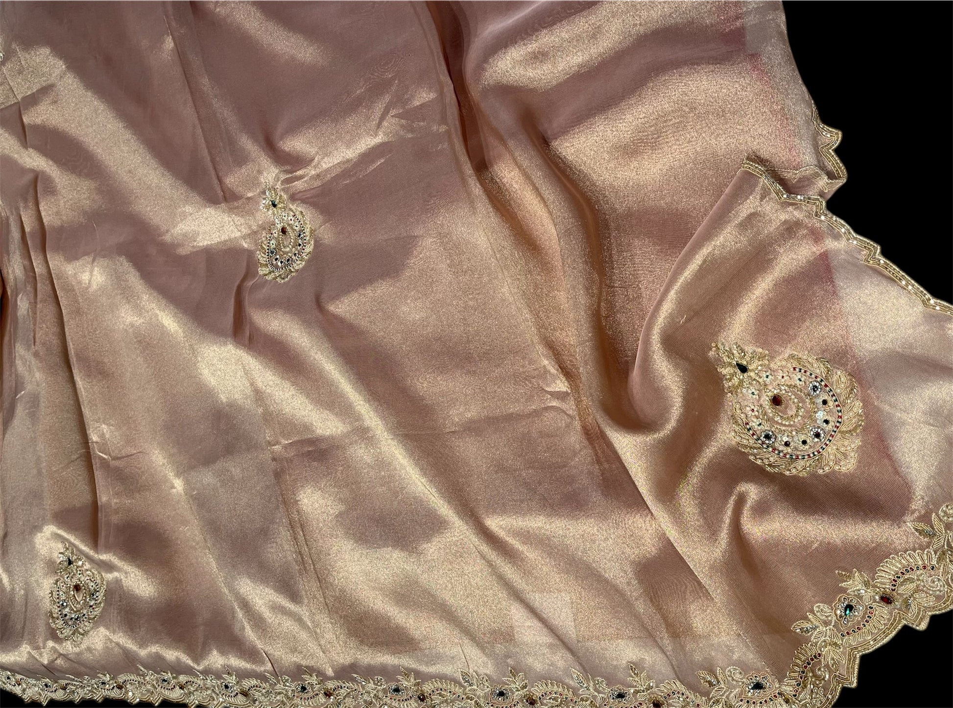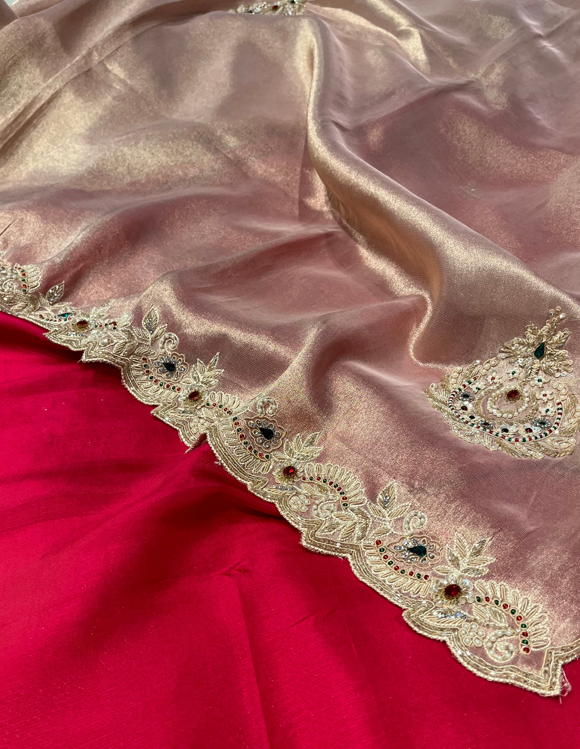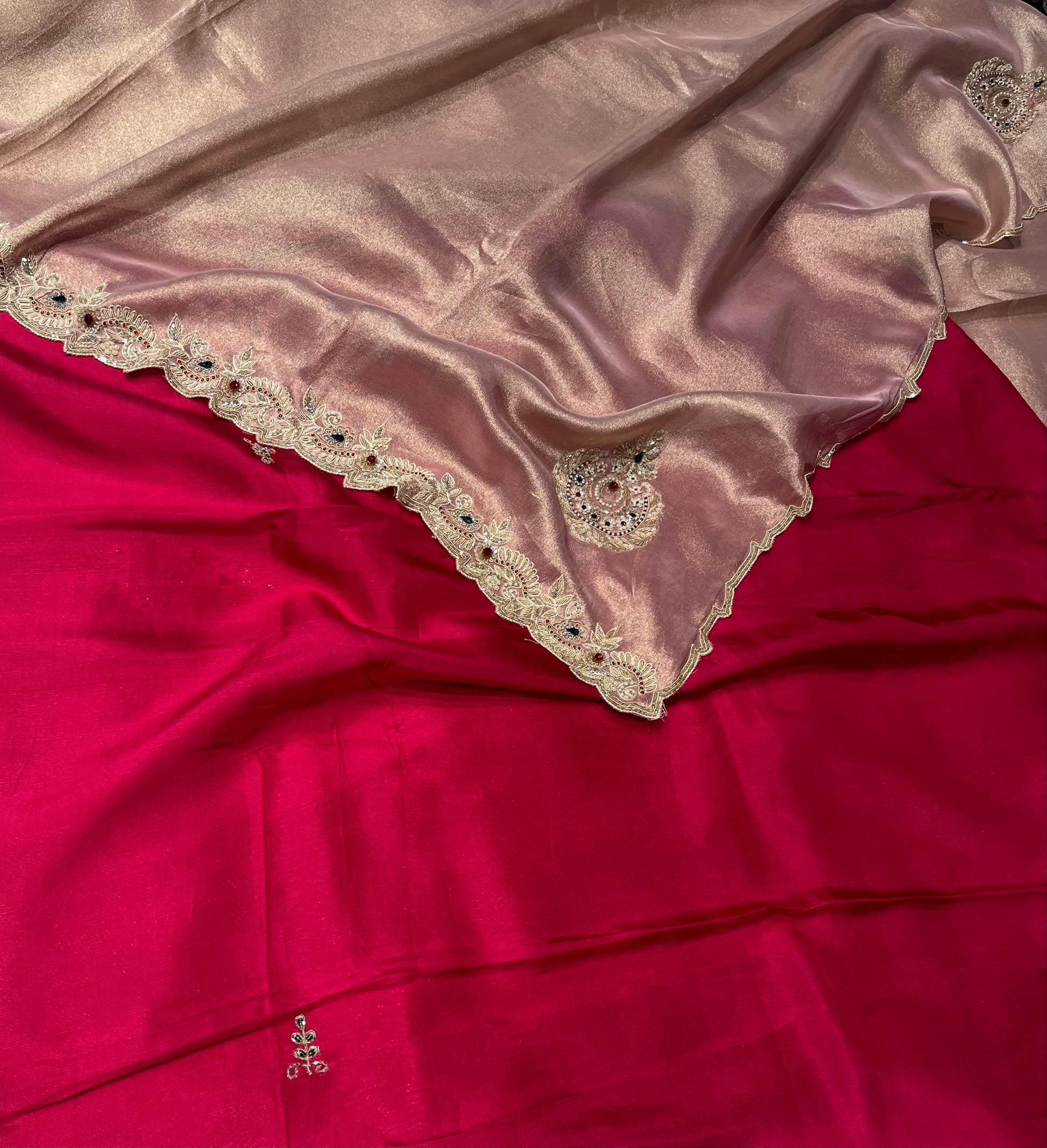 ROSE GOLD COLOR TISSUE SAREE EMBELLISHED WITH CUTDANA, SEQUINS & PEARLS WORK PAIRED WITH CONTRAST BLOUSE