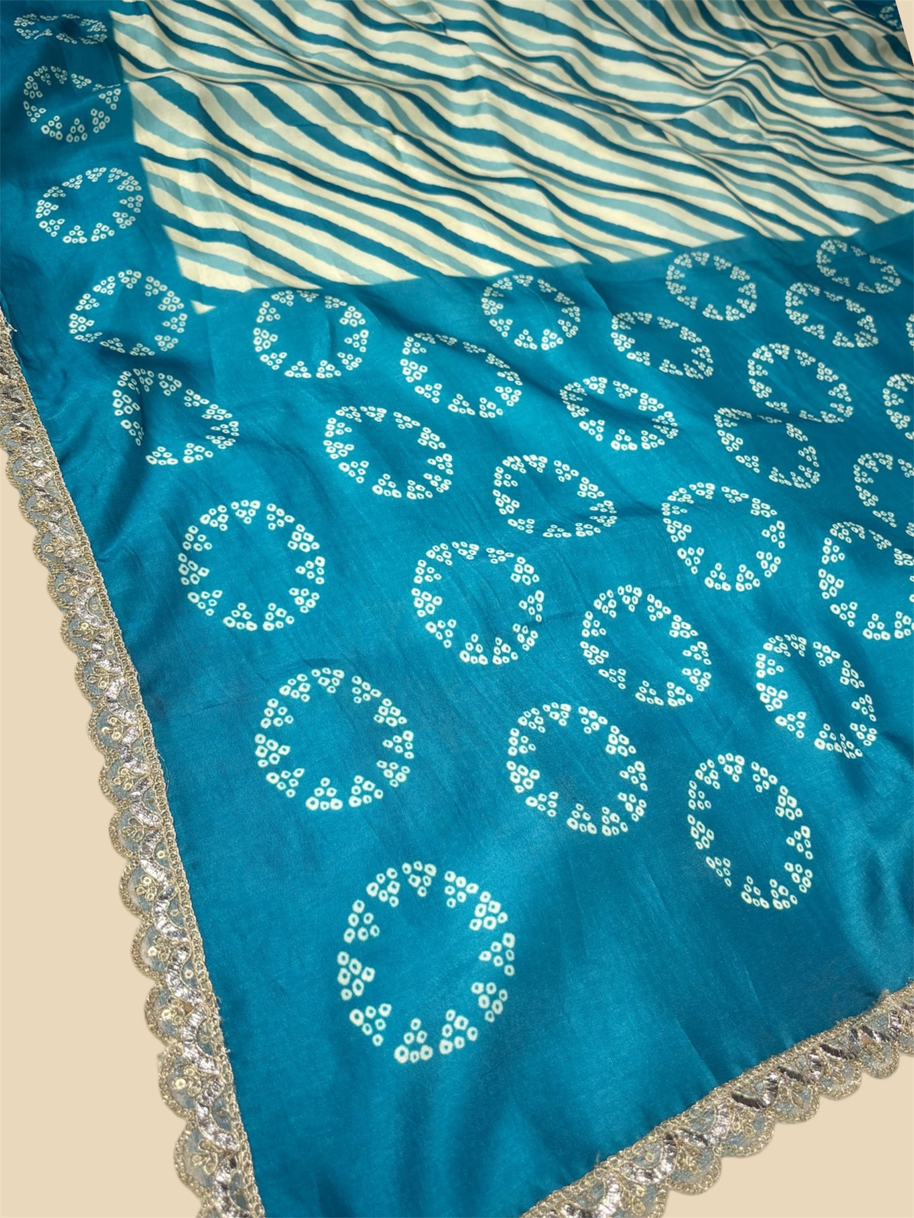 TURQUOISE COLOUR ART SILK LEHERIYA–BANDHANI PRINTED SAREE WITH LACE BORDER
