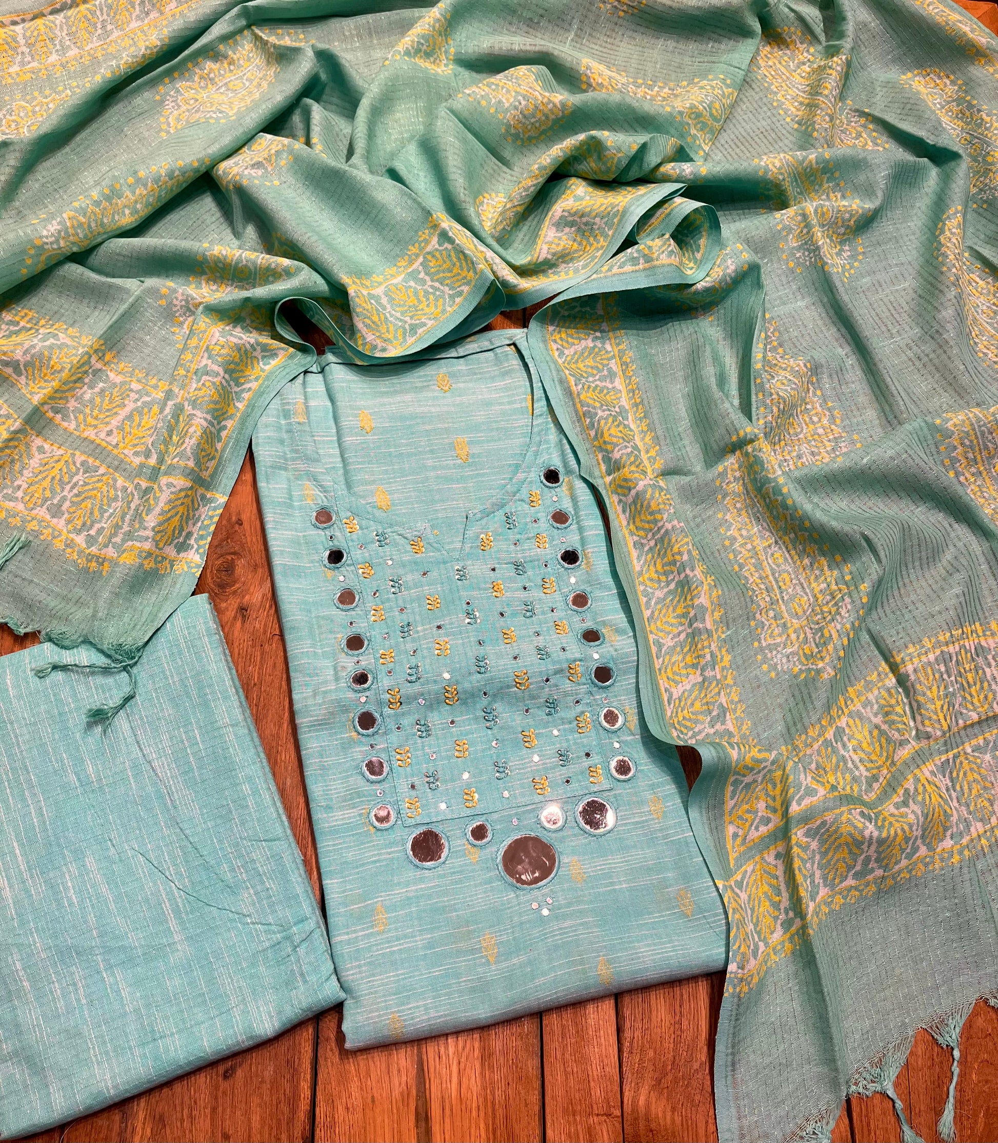 TURQUOISE COLOUR LINEN COTTON UNSTITCHED SUIT EMBELLISHED WITH MIRROR WORK