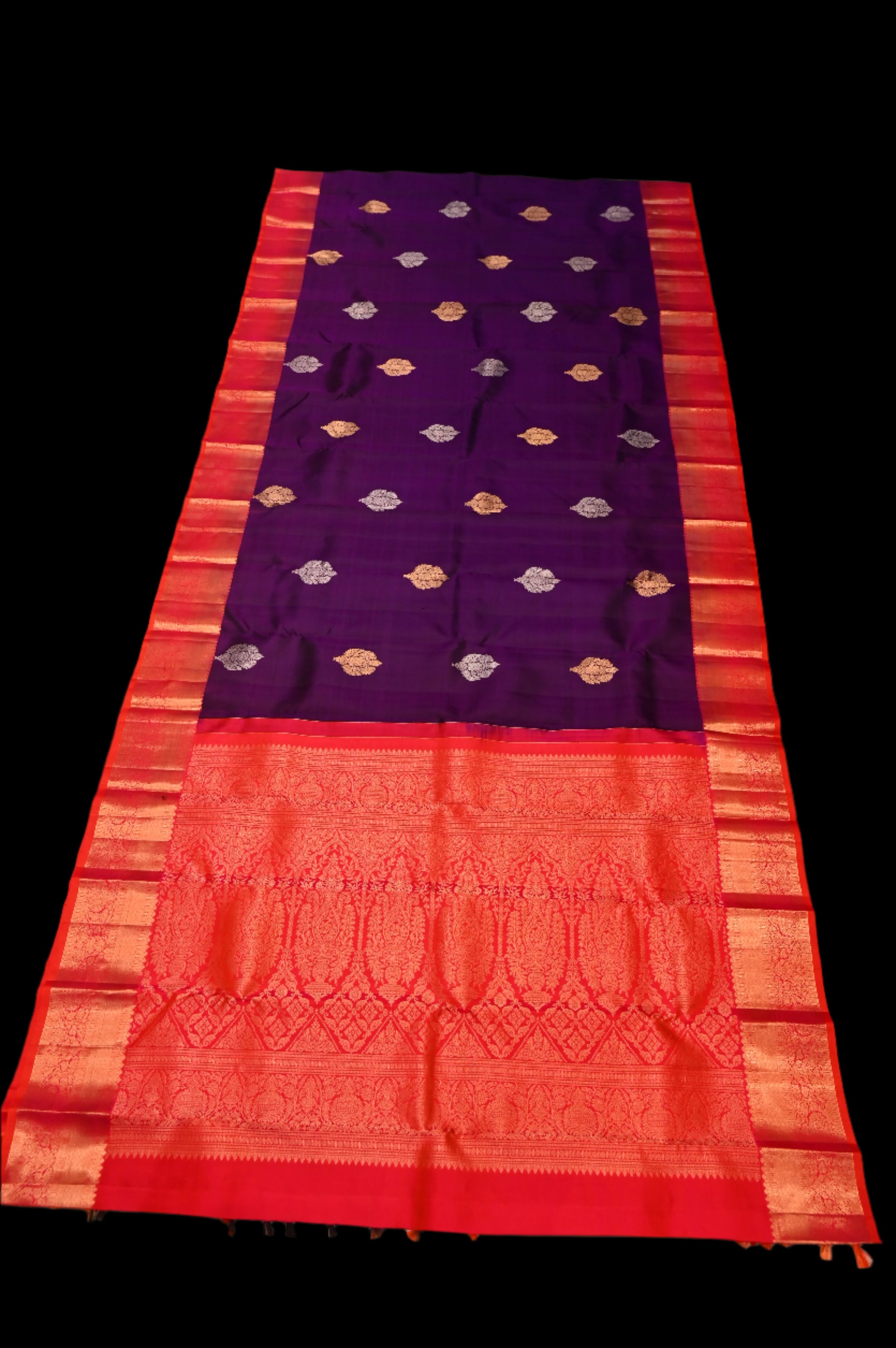 ROYAL PURPLE PURE KANJIVARAM SILK SAREE WITH GOLD & SILVER ZARI BOOTIES, CONTRAST BRIGHT RED PALLU & BLOUSE