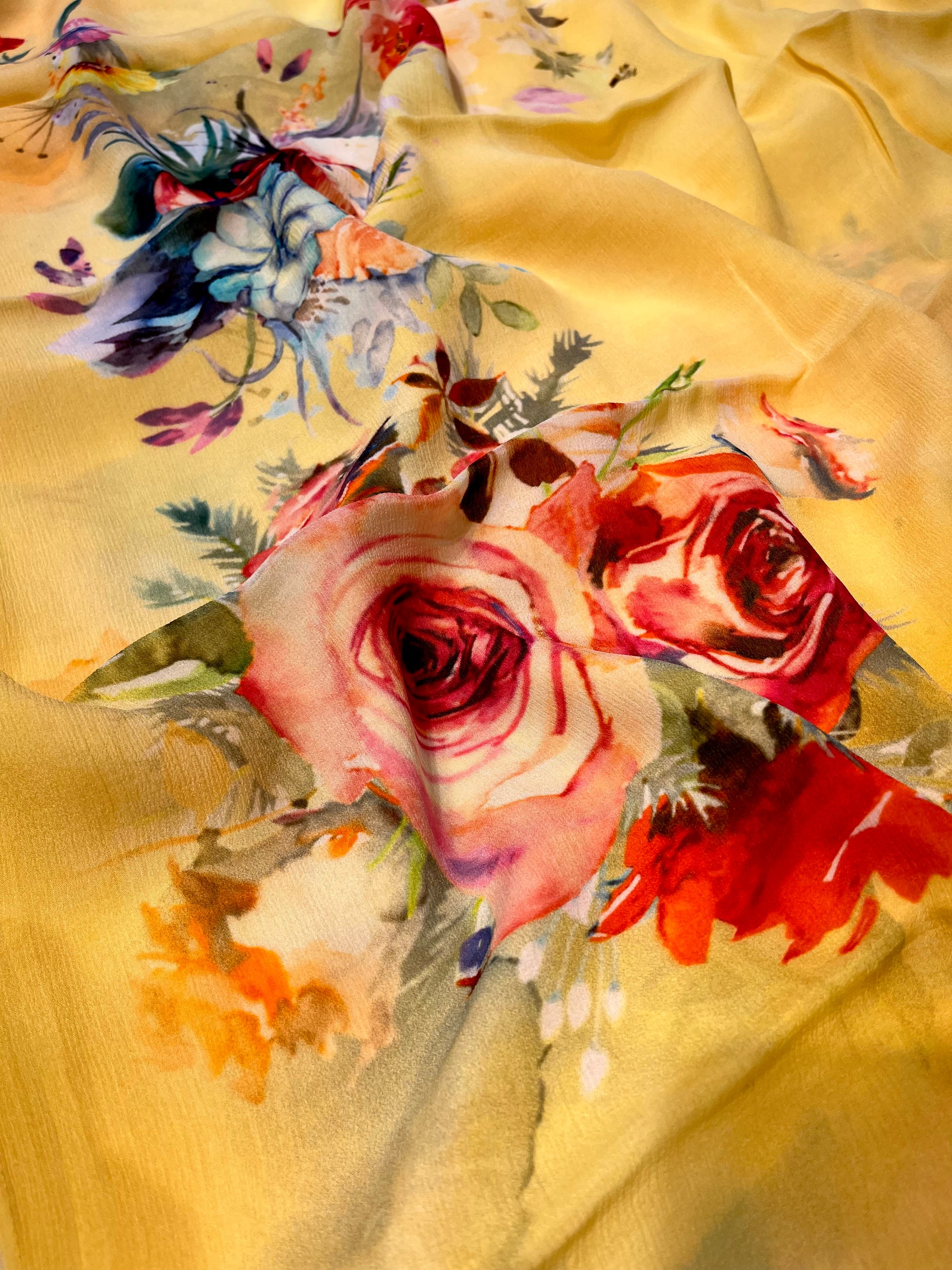 YELLOW CHINON PRINTED SAREE PAIRED WITH A PLAIN CREPE BLOUSE (DELIVERY IN 20 DAYS)