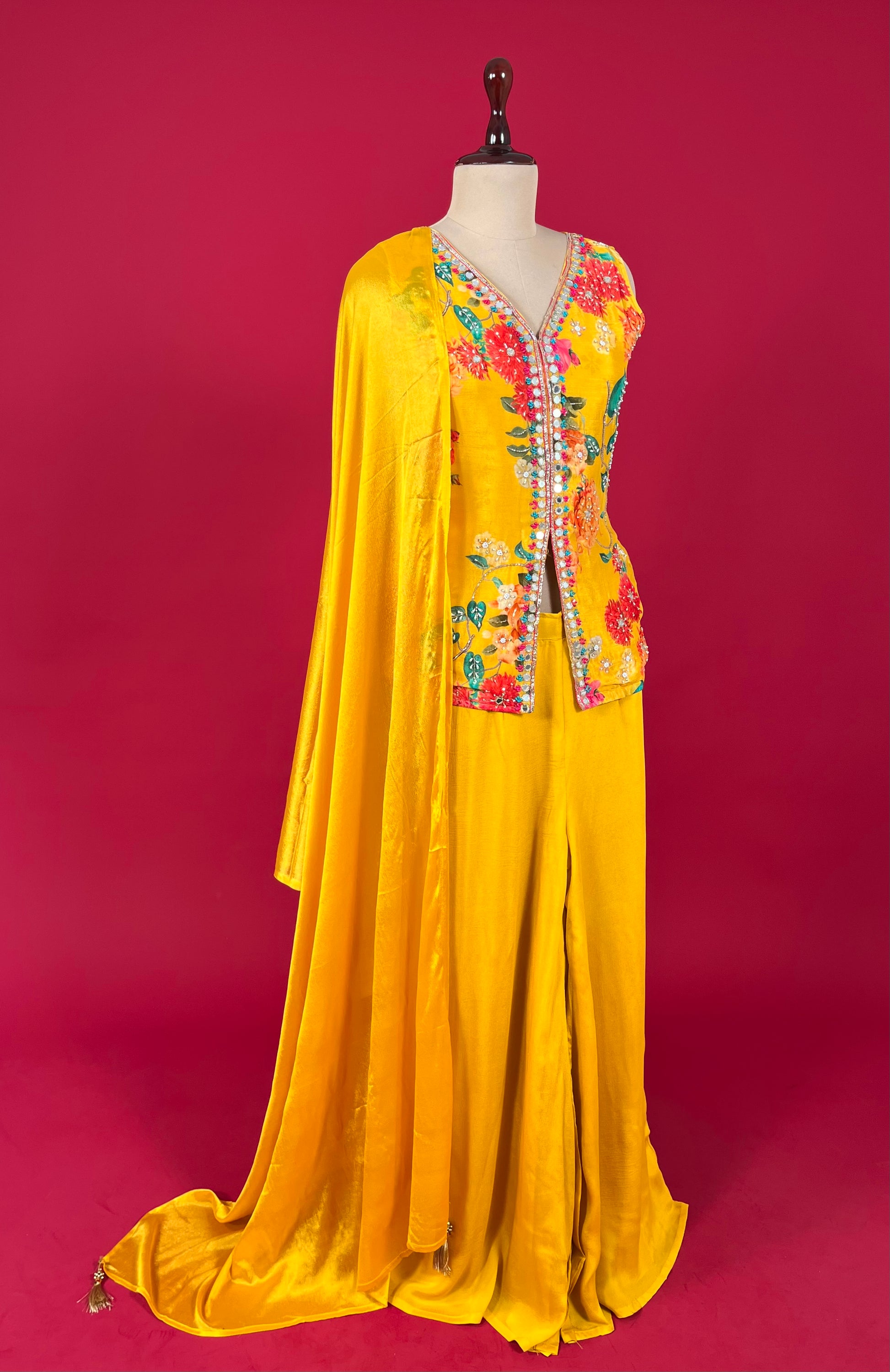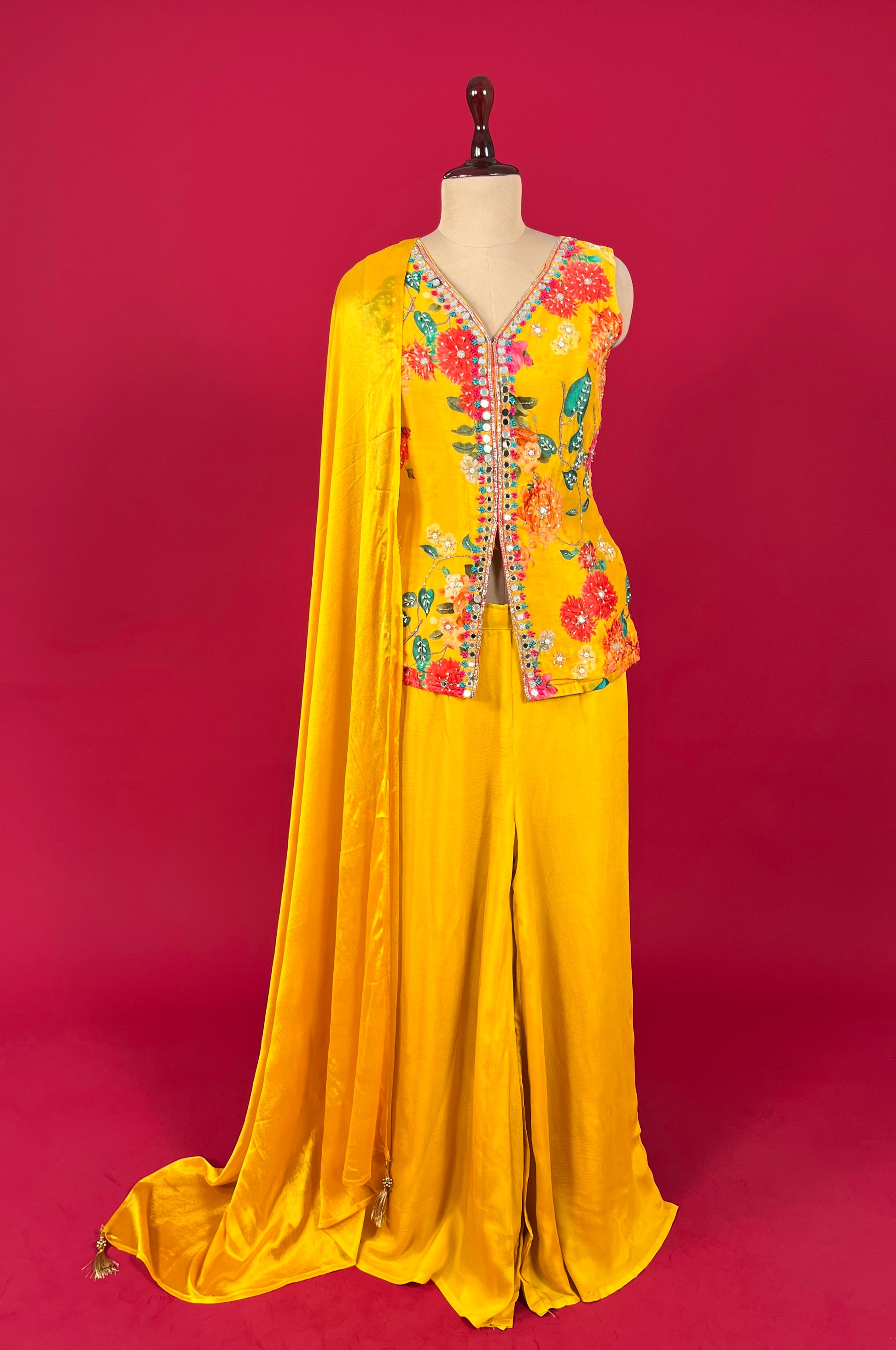 YELLOW COLOUR CHINON PALAZZO PANT WITH EMBROIDERED KURTA EMBELLISHED WITH MIRROR WORK