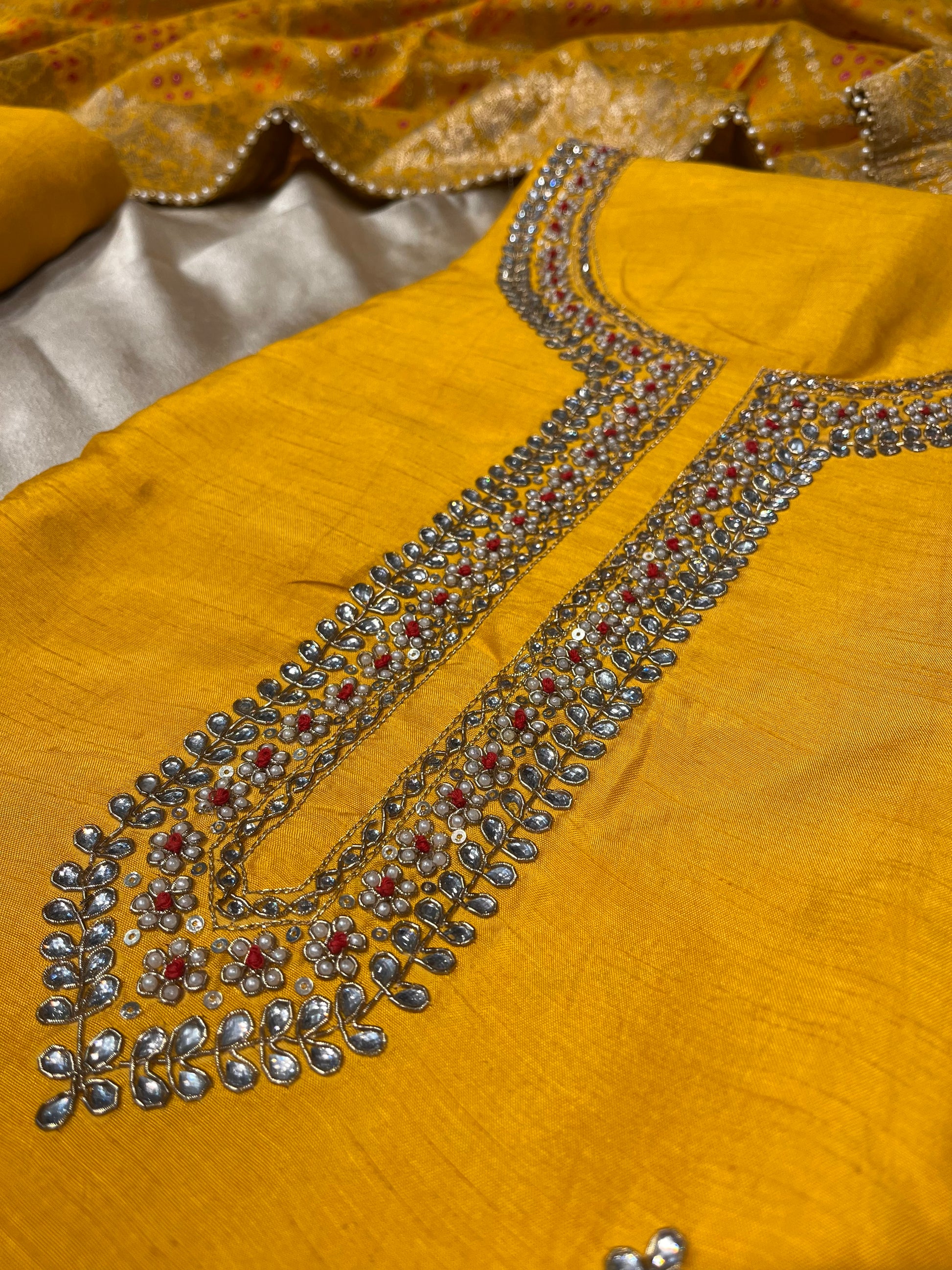 YELLOW COLOUR DOLA SILK UNSTITCHED SUIT WITH BANARASI DUPATTA EMBELLISHED WITH PEARL & ZARDOZI WORK