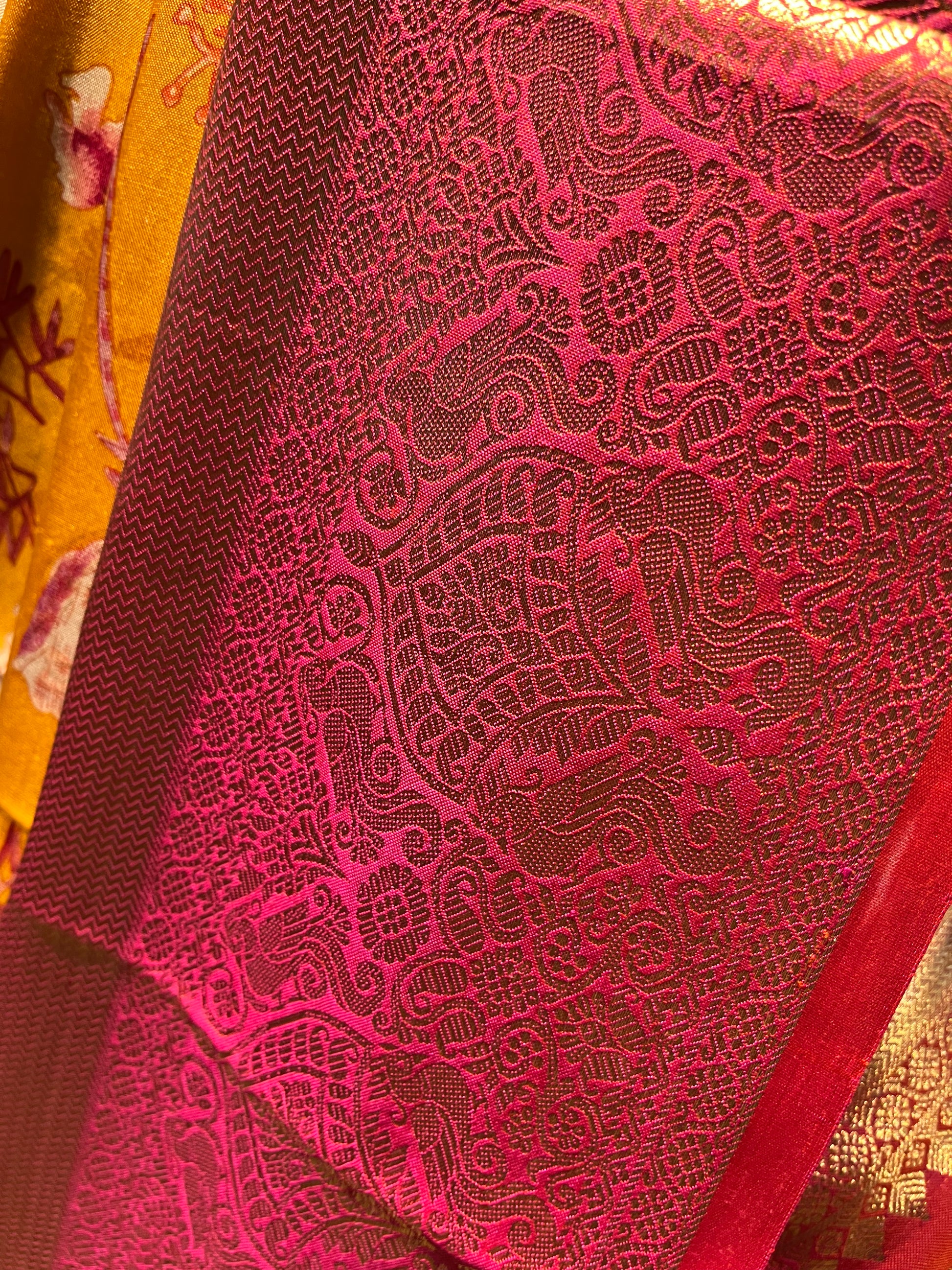 YELLOW COLOUR PRINTED PURE SILK SAREE WITH KANJIVARAM BORDER & PALLA