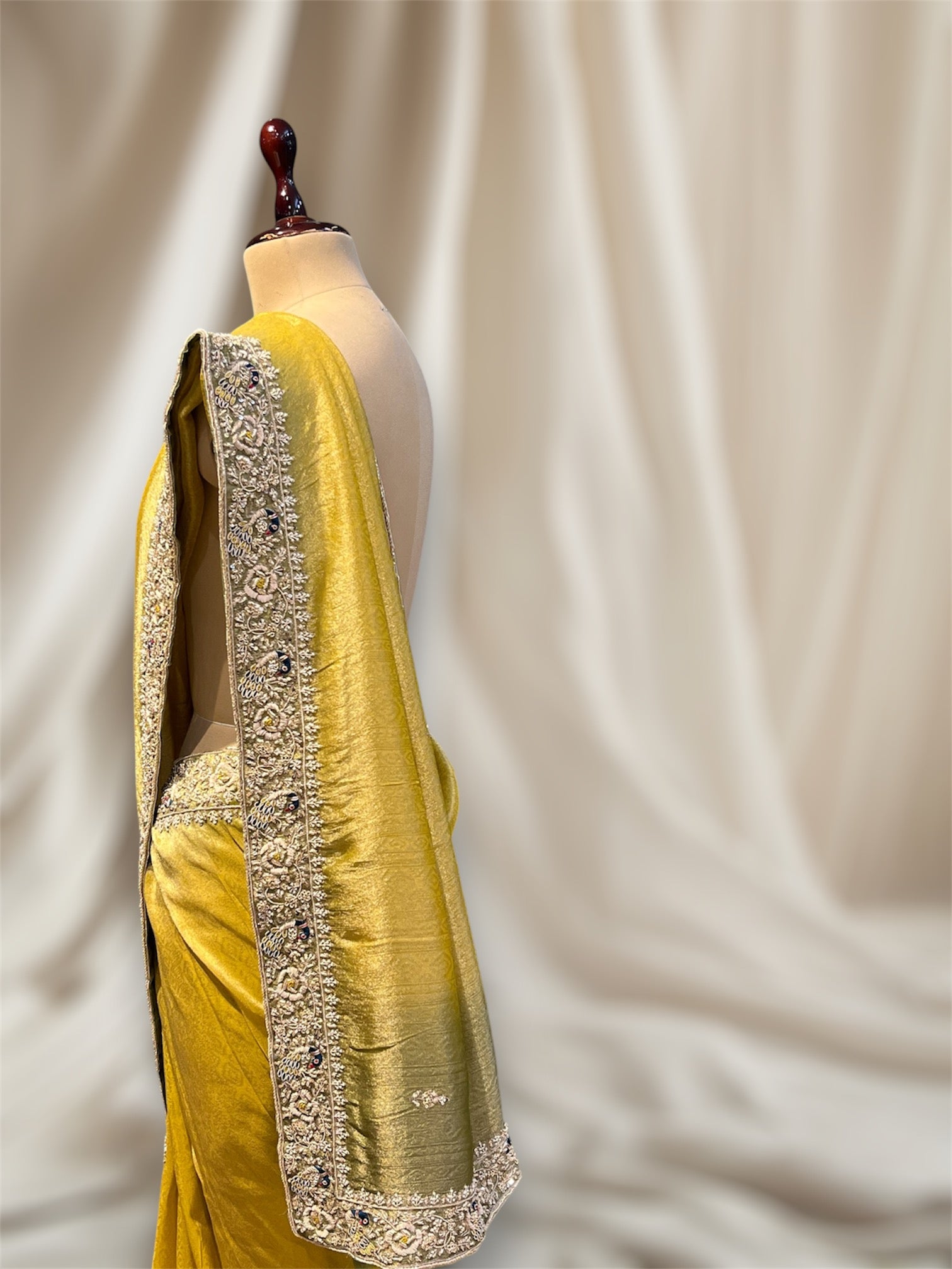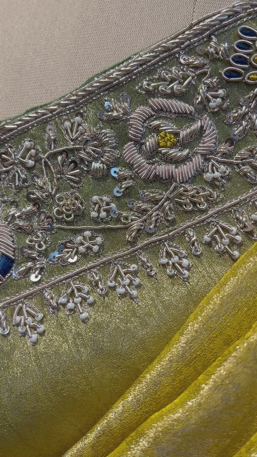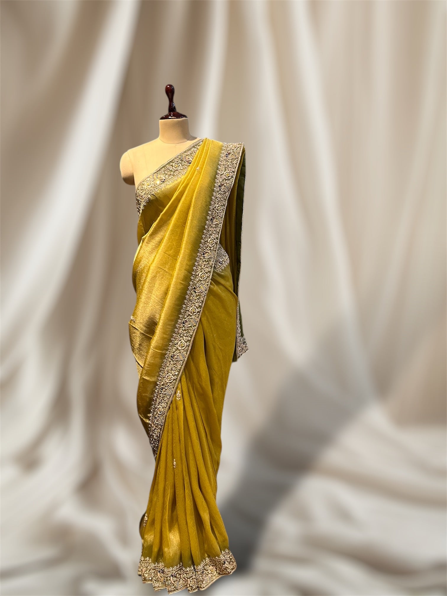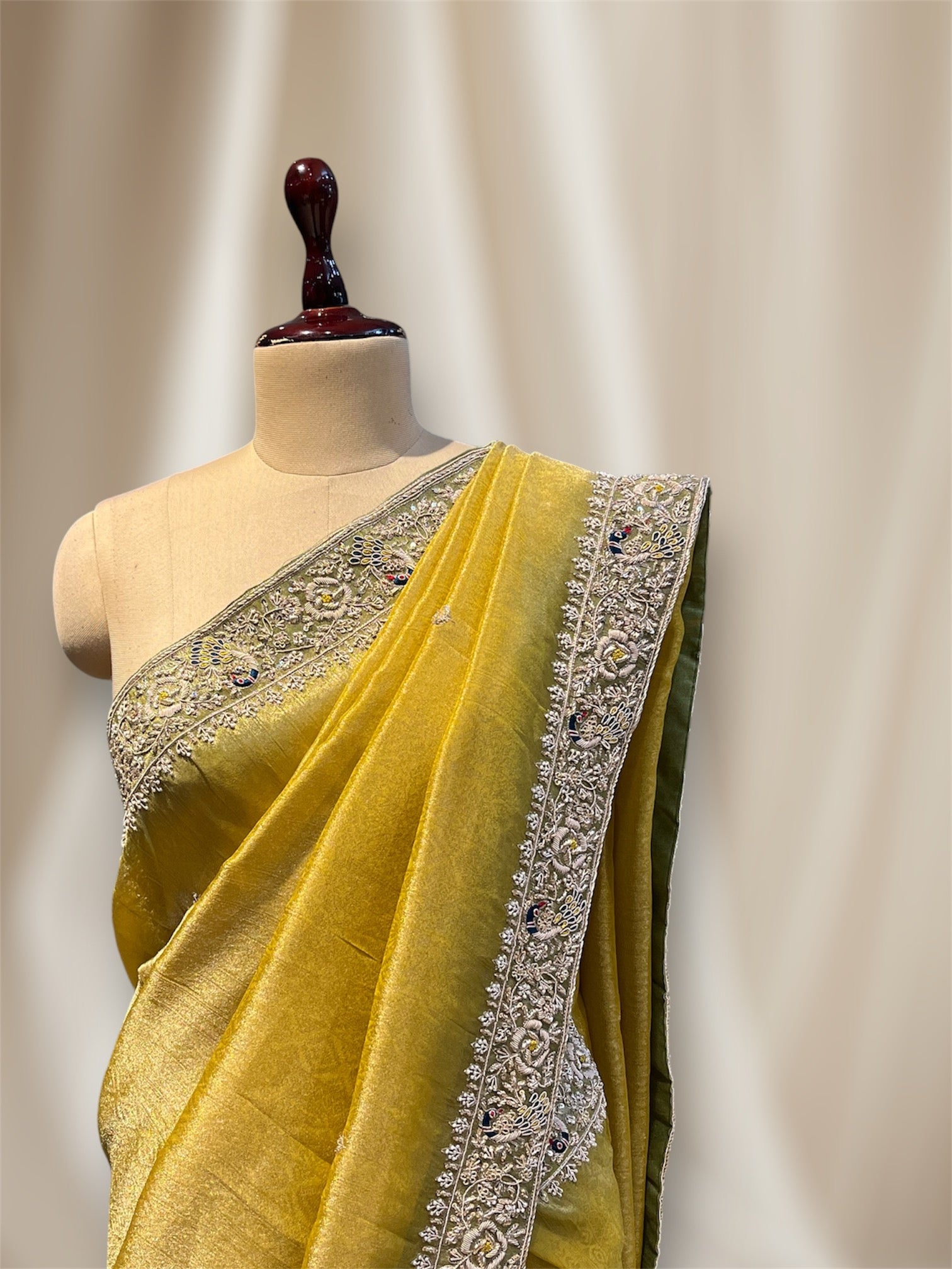 YELLOW GREEN SHADED COLOUR TISSUE SILK SAREE EMBELLISHED WITH ZARDOZI BOARDER